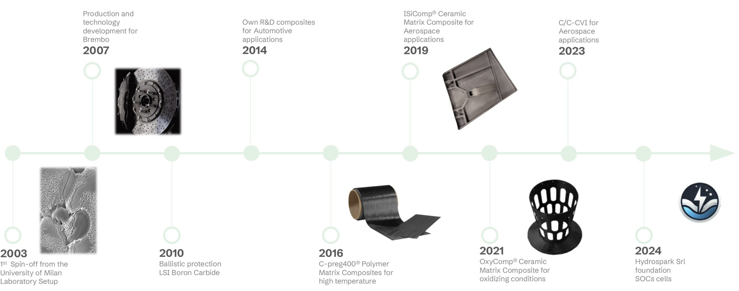 • In 2016, we entered the aerospace sector, pioneering ceramic matrix composites through Liquid Silicon Infiltration (LSI).
